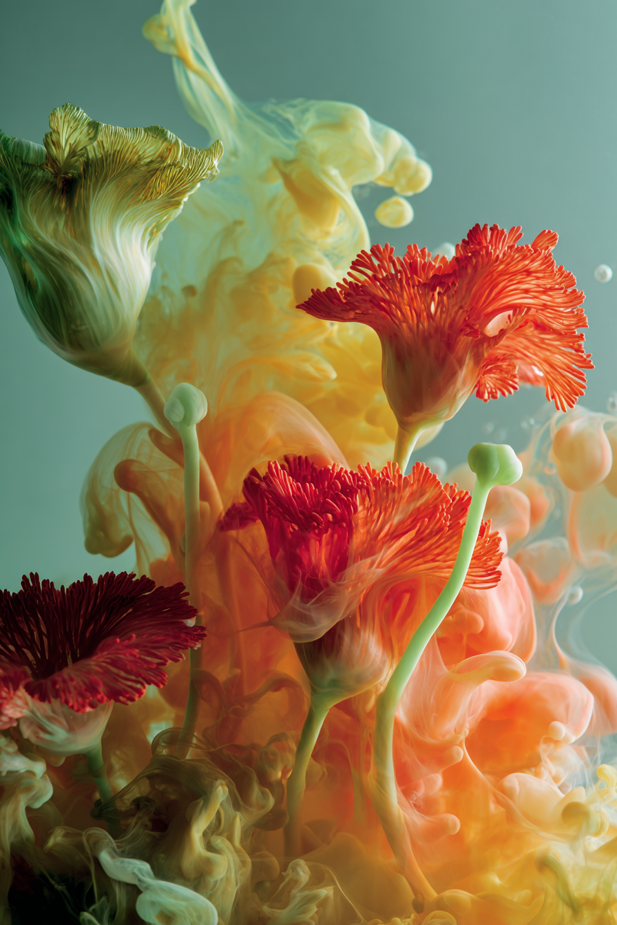 梦幻般的静物,风格化的珊瑚和红色的花朵融入流动的水彩墨水漩涡,柔软的金色大理石花纹和淡绿色的植物口音。该组合将有机花卉融入抽象纹理,唤起平静和优雅。在背景中,柔和的象牙色逐渐变成温暖的琥珀色和玫瑰色。水彩与酒精油墨融合风格。