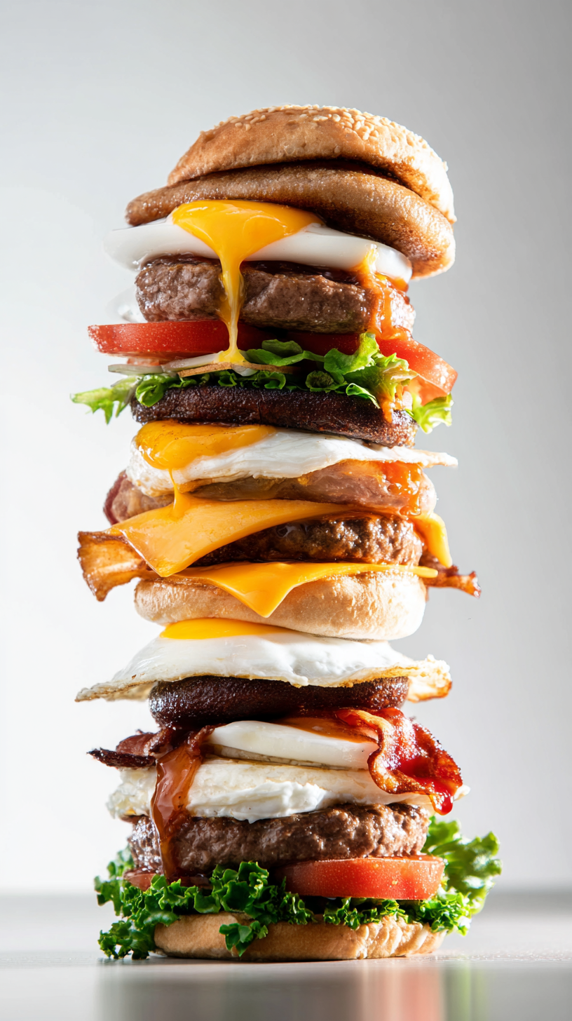 一个高约50厘米的超高汉堡的超现实高分辨率照片,堆叠着多层面包、牛肉饼、培根、煎蛋、融化的奶酪、新鲜的生菜、西红柿、洋葱和酱汁,排列整齐,平衡,站在干净的白色表面上,明亮的工作室灯光,白色无缝的背景,食品摄影风格,焦点锐利,纹理开胃,专业的商业食品广告风格