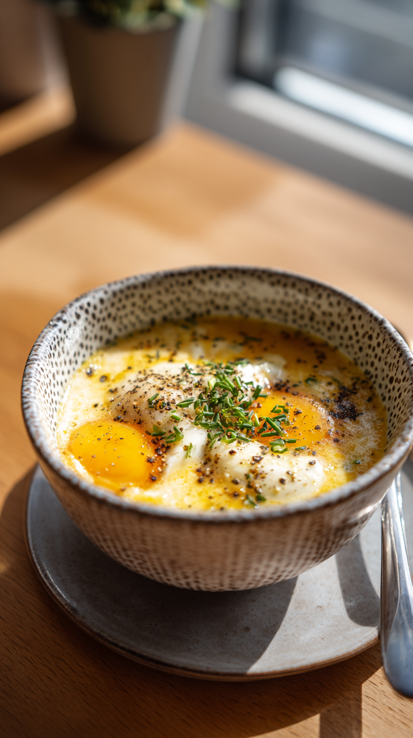 特写,高质量的图像Keto鸡蛋汤在一个质朴的灰白色陶瓷碗与斑点边缘服务。汤是金黄色的,丝滑的蛋带漂浮在清澈的肉汤中,上面放着切碎的葱和少许黑胡椒。自然的阳光洒在现代的厨房柜台上,碗旁边放着一把银勺子。舒适和现代的厨房背景。