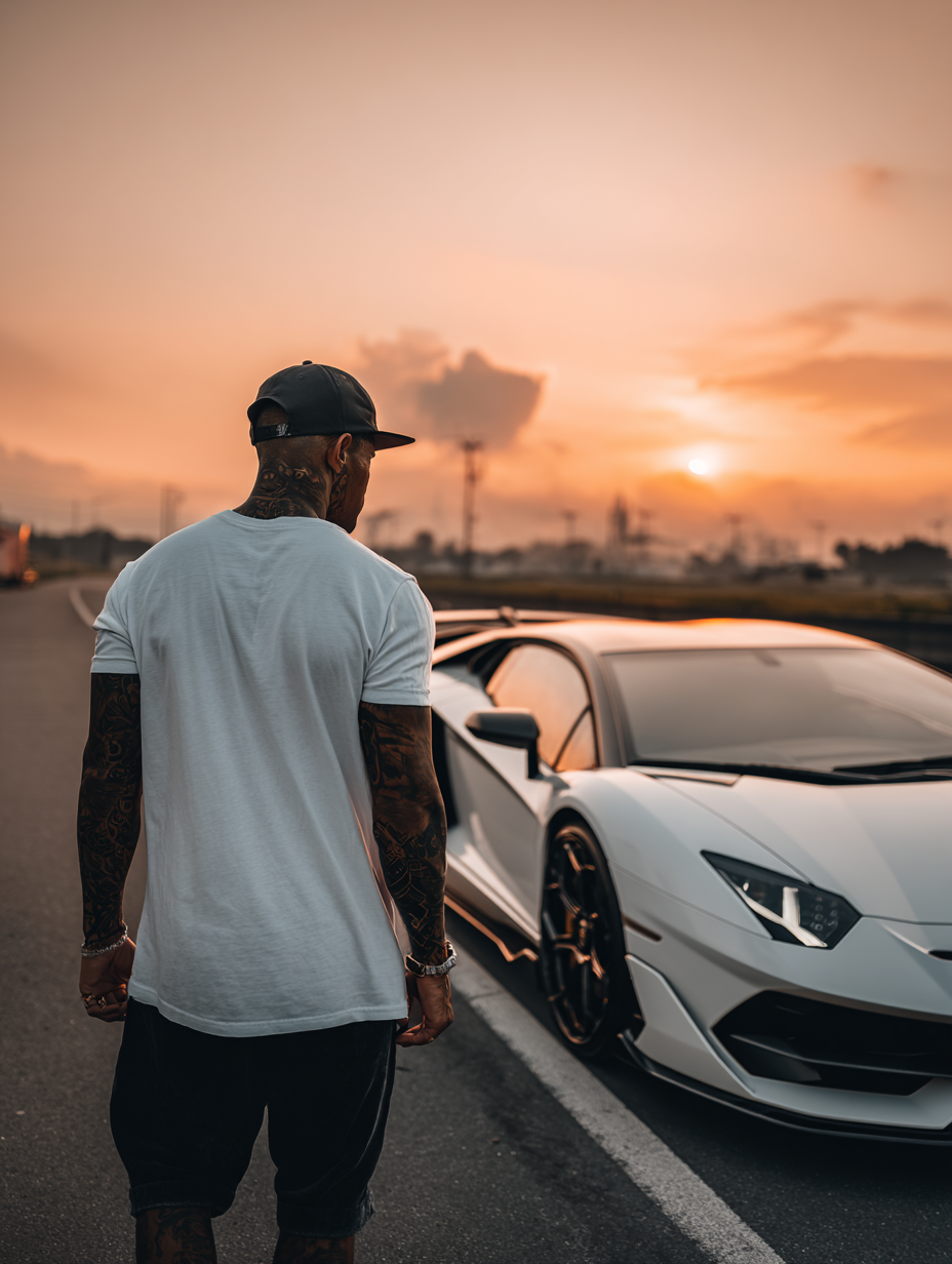 从后面拍摄,街头服饰,没有标志的白色t恤模型,穿着t恤有纹身的英俊混血男子在英国乡村公路上与橙色兰博基尼aventador svj,高分辨率,高细节,高质量的摄影,使用专业相机和镜头拍摄的超逼真照片。动漫街头时尚海报氛围