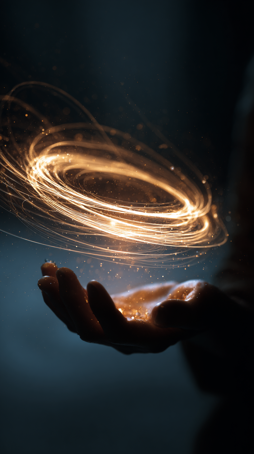 神秘的插画展示了一个无尽的金色能量圈,象征着业力,女性的手释放的光返回到她的手掌,宇宙的背景,命运的发光流,精神平衡,极简主义的神秘风格,黑暗的背景,空灵的照明,优雅的构图,现代深奥的美学