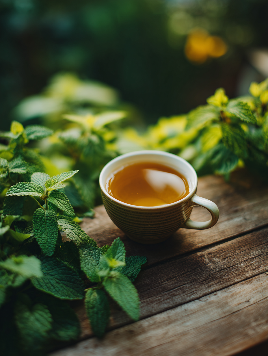 一杯柠檬香蜂草茶,放在木桌上,周围是新鲜的柠檬香蜂草叶子,早晨的自然光,柔和的绿色色调,平静和治愈的氛围,微特写摄影风格,模糊的背景,高细节,自然的阳光反射在茶上,和平的植物成分,舒缓和有机的美学灵感来自安东尼威廉和医学媒体视觉效果。