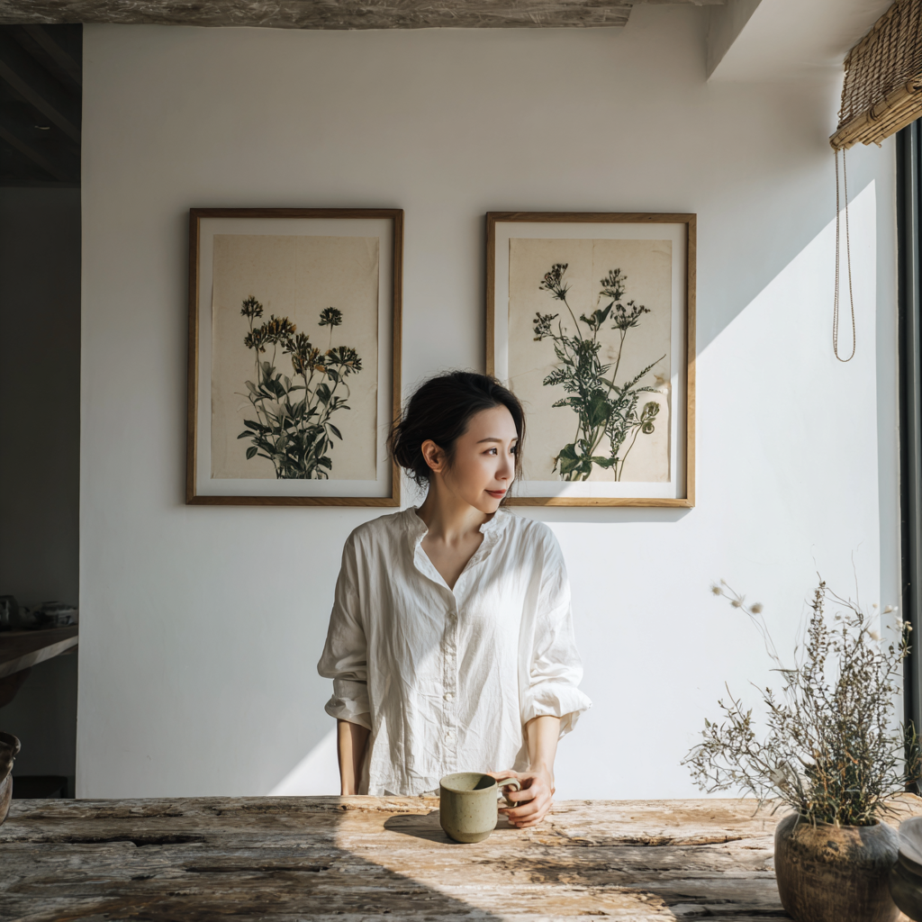 这是一张专业的室内照片,拍摄的是北海避暑别墅里一个极简主义的斯堪的纳维亚餐厅。在白色的墙上,两幅优雅的橡木框植物艺术版画并排展示着精致的野花。一个女人站在一张古朴的再生木餐桌旁,手里拿着一个陶瓷马克杯。专注于极端解剖现实主义的手和脚。这一场景充满了明亮、清爽的海岸晨光。高端生活方式摄影,一期XF拍摄,35mm镜头,真实的木材和纸张纹理