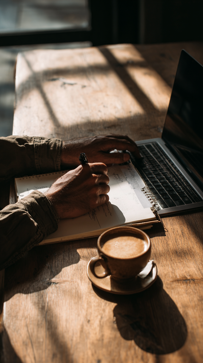一个人在柔和的日光下在干净的桌子上使用笔记本电脑的超现实电影图像,微妙的元素暗示了连续性(一个有几页标记的笔记本,一杯咖啡,自然光线变化的色调)。双手平静地与笔记本电脑互动,看不见脸。平衡的构图,宁静自信的心情,专业的生活方式摄影风格,慷慨的负空间文字放置,没有标志或可读的文字