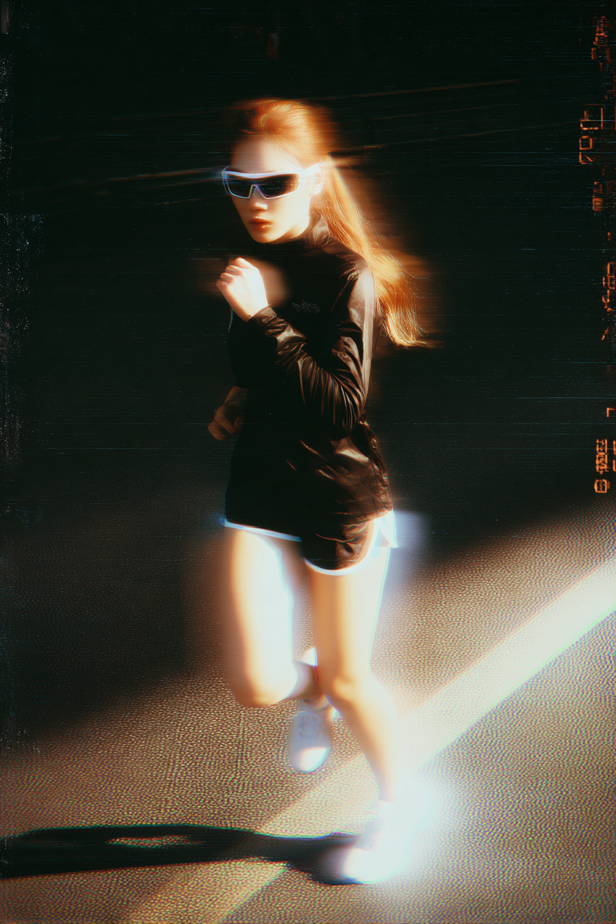 年轻女子,金发或黑发,在市区奔跑。他们穿着黑色高性能技术运动上衣,跑步短裤,白色跑鞋,戴着反光的跑步太阳镜。图像是黑暗的,带有颗粒状的胶片纹理和令人困惑的运动模糊。8 k