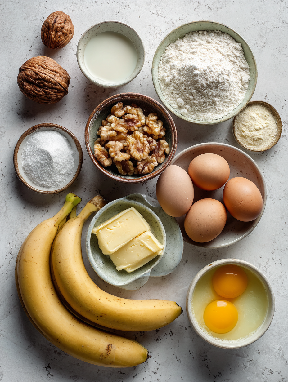 香蕉面包的食物摄影,奶油芝士馅料整齐排列在干净的白色大理石表面,明亮的自然光线,专业的美食博客风格,构图干净有序,俯视图,高细节,极简美学。配料:熟透的香蕉泥、砂糖、包装红糖、融化并稍微冷却的无盐黄油、鸡蛋、香草精、中筋面粉、小苏打、泡打粉、细盐、切碎的核桃或山核桃、软化的奶油奶酪、馅料砂糖、蛋黄、柠檬汁或柠檬皮、馅料面粉。食材陈列在小碗、杯子和罐子里,风格就像食物博客的食谱准备,焦点清晰,布局均衡