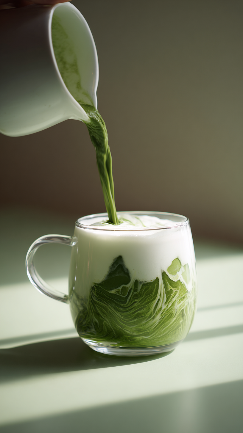 从侧面看,充满活力的绿色抹茶被倒入已经装满牛奶的透明玻璃杯中,抹茶在牛奶上旋转和分层,柔和的自然光线从侧面照射,平静而简约的日本风格设置,干净优雅的构图,温暖的大地色调,高级咖啡馆美学,斯堪的纳维亚-日本融合风格,编辑食品摄影外观,浅景深,柔和的阴影