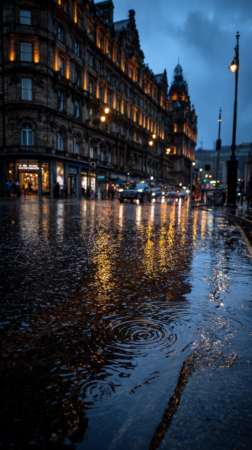 这是20世纪欧洲城市黄昏时潮湿的鹅卵石街道的电影照片,雨水严重泛滥。巨大的同心涟漪在黑暗、反光的水面上蔓延开来,与图片e_9.png中的模式完全吻合,只是没有了汽车。煤气灯在荡漾的水面和潮湿的石头上投下温暖、金色的倒影。华丽的维多利亚式建筑点缀着铁艺阳台和煤气灯。在朦胧的背景中,马车和打着伞的行人的剪影遥不可及。气氛是喜怒无常和大气的。低角度拍摄