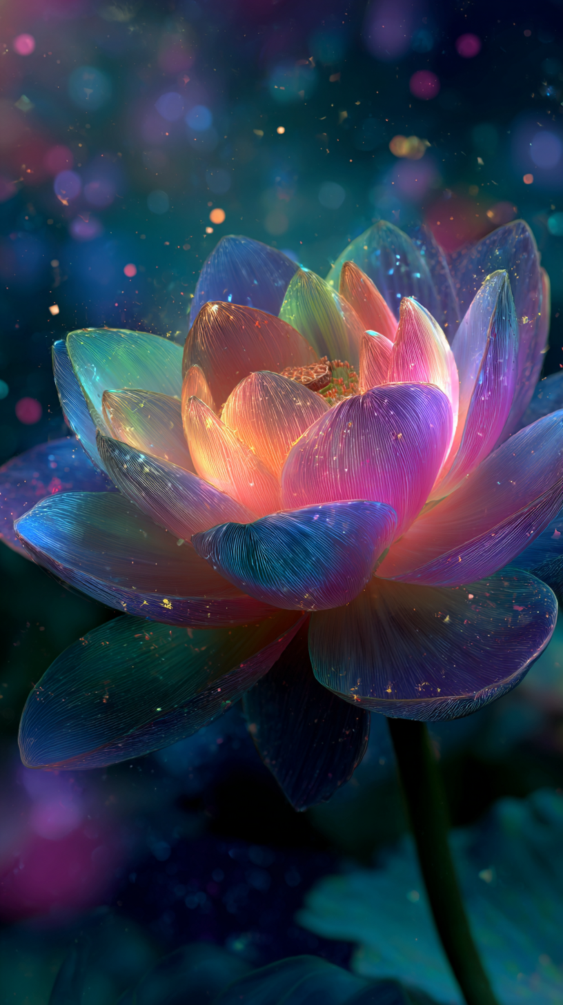彩虹之光花卉世界提示:在历史上最视觉上令人惊叹和情感上迷人的形象,多色发光的花朵在整个领域中转移色调,霓虹渐变平滑混合,宇宙天空与蓝绿色,粉红色和紫色的星星漩涡,宁静的夜晚幻想,夜晚,创造一个舒适迷人的场景,c4d, 3d动画,8k,