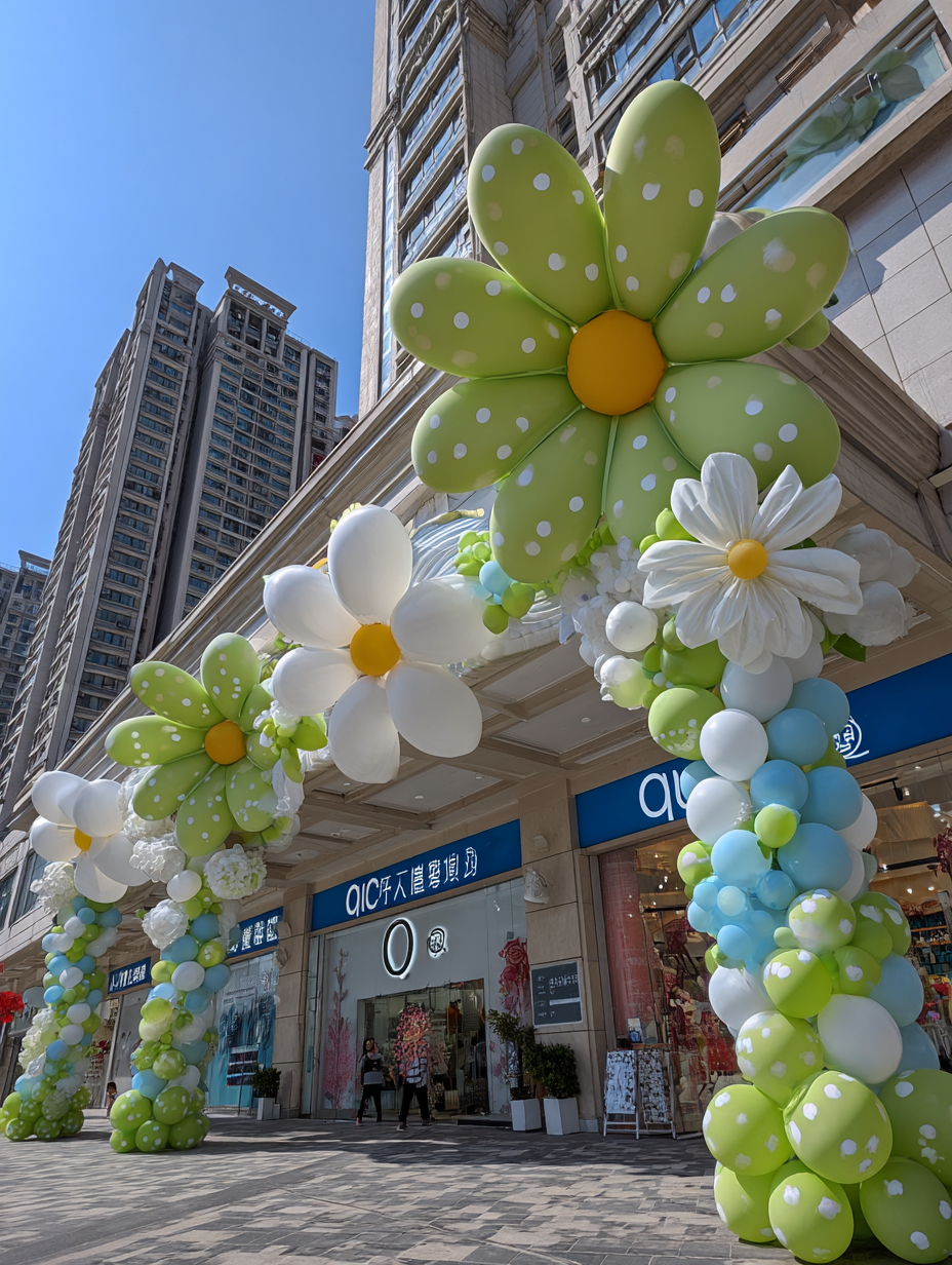 户外购物中心屋顶上的气球艺术装置以柔和的大花朵和带有白点的小气球为特色,在q标签商店入口上方形成了美丽的展示。商店名称“q屏幕”在它们下面可见。头顶的蓝天增添了欢快的气氛。这个场景通过柔和的色调和异想天开的设计元素捕捉到了春天充满活力的能量。Midjourney中文版绘画出图效果: