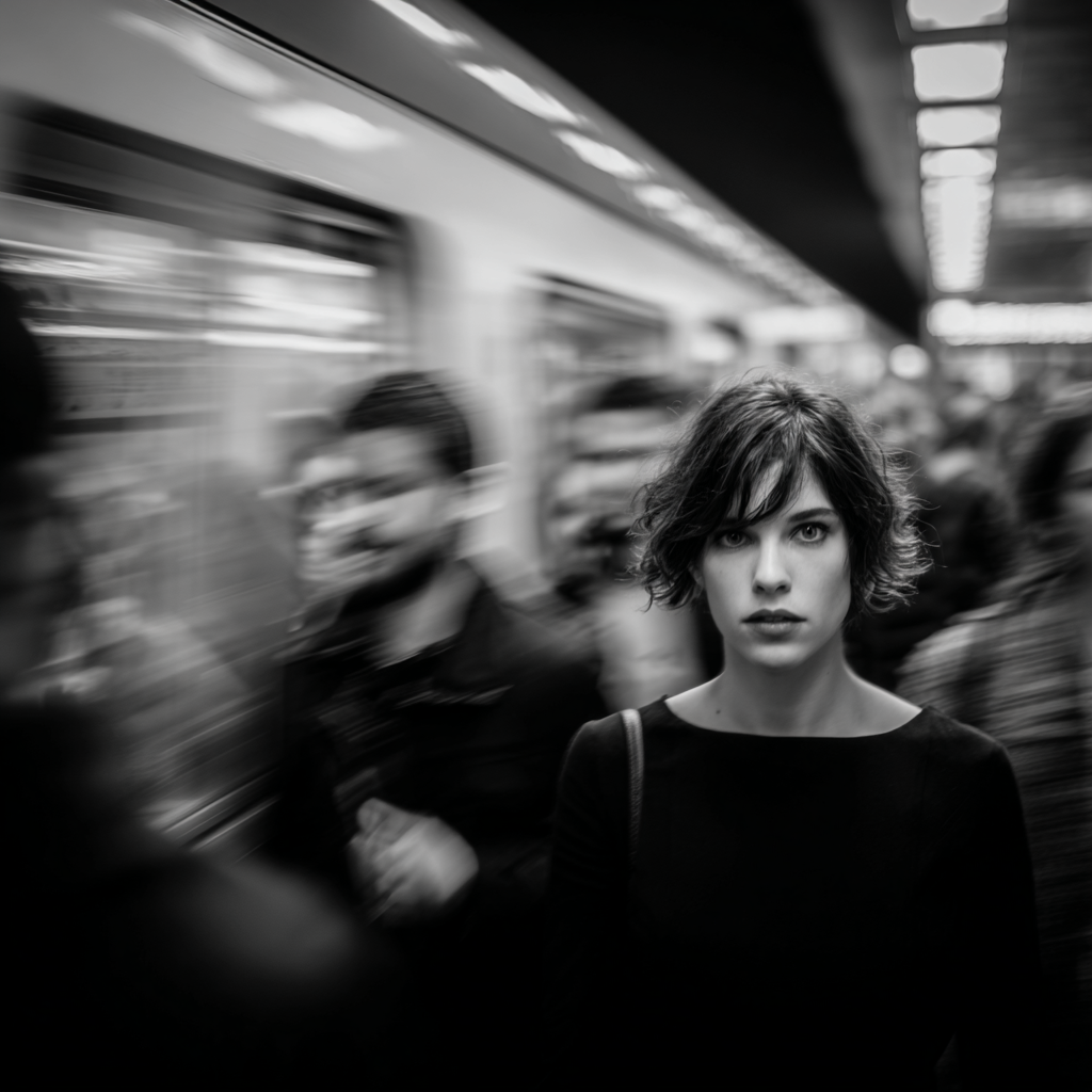 MJ中文版提示词:用徕卡SL3用50mm Summilux在f/2.8下拍摄的电影动态模糊摄影,使用慢速快门平移从胸部正面角度拍摄。照明设置:平坦的阴天作为柔和的扩散,允许长模糊轨迹没有强烈的对比。色调:黑色和白色的灵感来自A24电影。实验对象:一名28岁的女模特完全静止站立,眼神锐利,短卷发,面部对称,真实皮肤毛孔可见,穿着低调时尚。人群活动:数百名通勤者从各个方向冲过去,身体伸展成平滑的水平和对角线模糊。情感:在寂静中平静地反叛。美学:编辑的冷静vs混乱。后:干净的运动物理,精细的颗粒,没有故障,没有面部变形,没有扭曲的解剖。